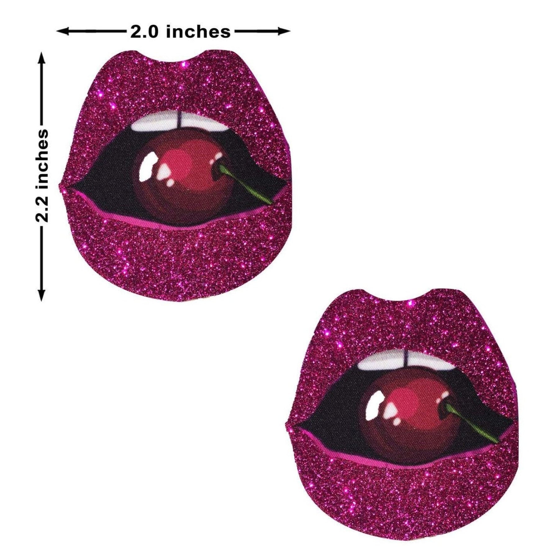 Entice and enthrall with these single use glitter nipple pasties. Cherry red lips gently biting a cherry to adorn yourself with. It will be all the inspiration anyone needs.