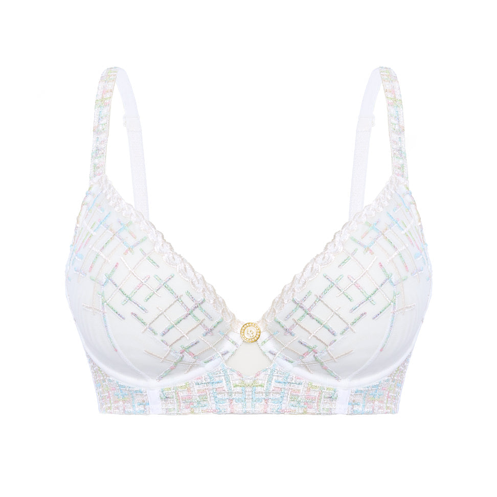 The Tweegy Plunge Bustier in Cupcake mixes playful faux tweed with hand-beaded straps and stylish Cuban chain details. Its daring plunge and convertible straps give you a flirty, custom fit, adding chic fun` to your lingerie collection.