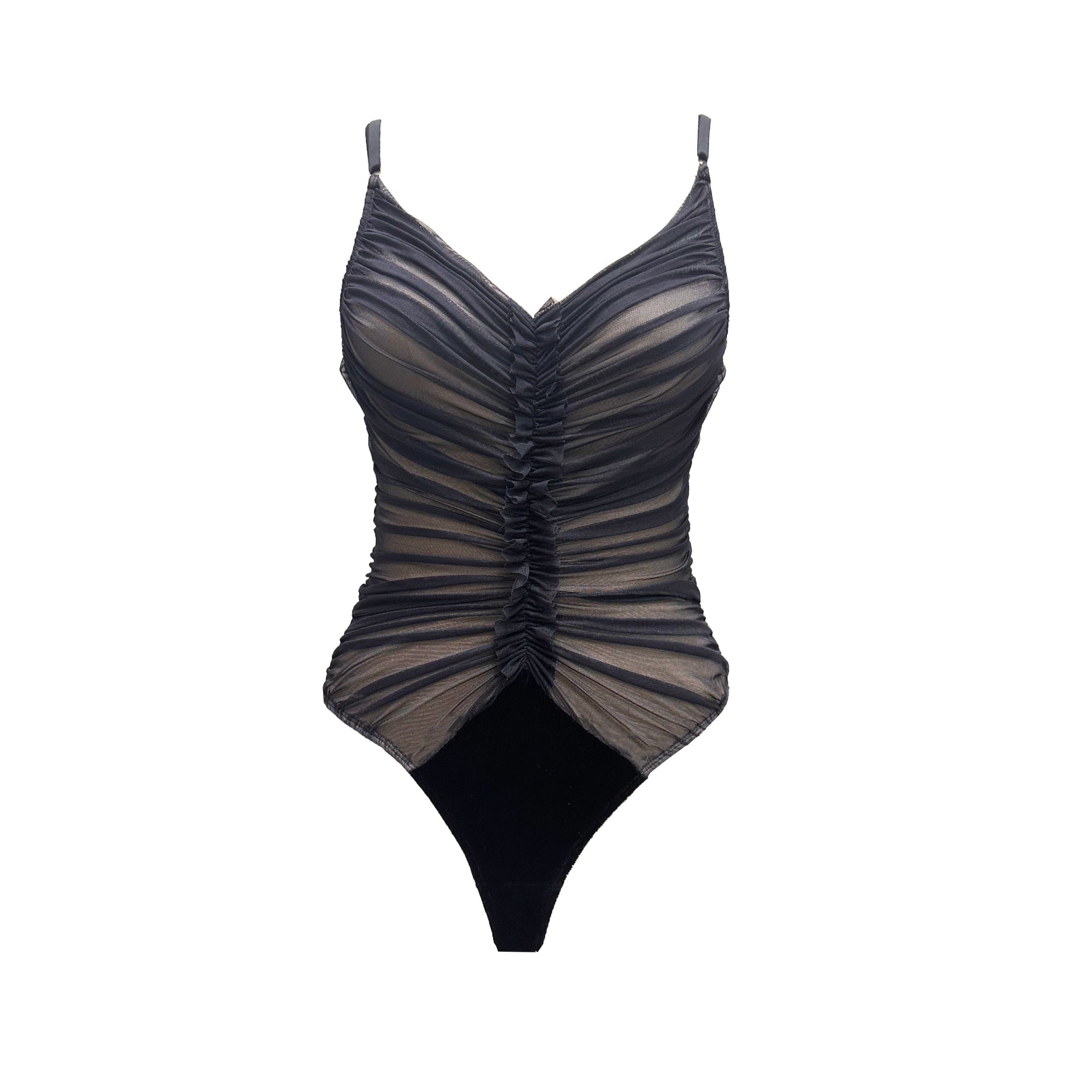 Expertly designed for a flawless look, the Terminator Tulle Ruched Bodysuit is constructed with luxurious soft stretch tulle and features a V neck and front frou frou detail. The garment is entirely lined with nude mesh and includes a velvet inner thigh detail. With adjustable straps and a thong back, this bodysuit offers a flattering fit for any body type.