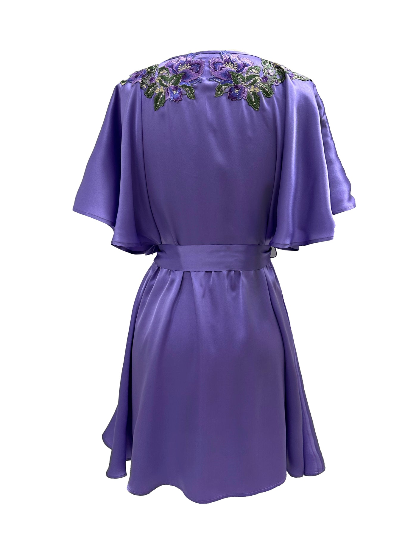 Woman wearing a purple satin robe with floral embroidery on the back.