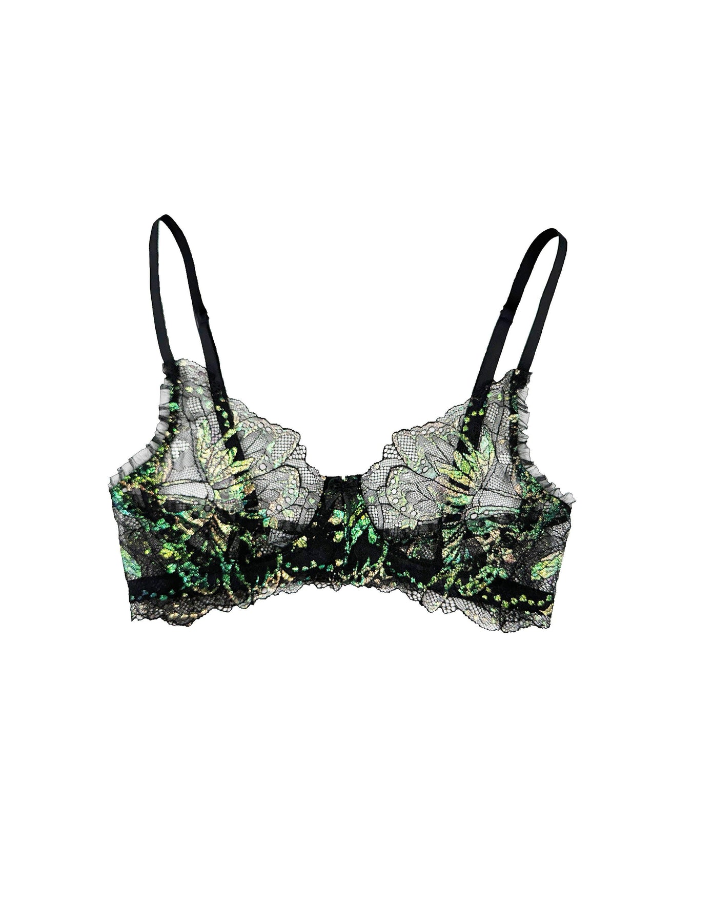 Expertly designed for small-chests and transgender individuals, the Psyche Iridescent Lace A-Cup Exclusive Bra is the first of our A-cup exclusive line. It features iridescent metallic lace for a touch of magic and with its longline and deep V-neck design, unlined and sheer material, and ruffle organza trim, this bra brings you that feminine and flattering fit. Complete with rose gold metal hardware, it's available in black from sizes 32A thru 40A.