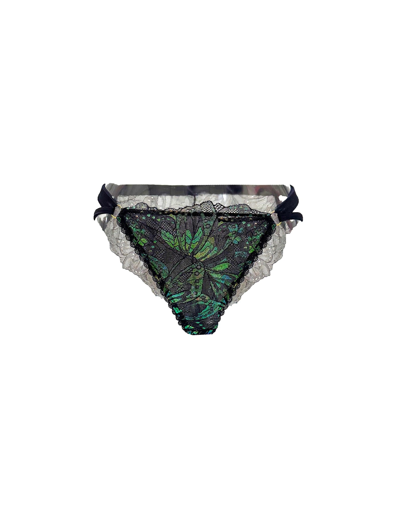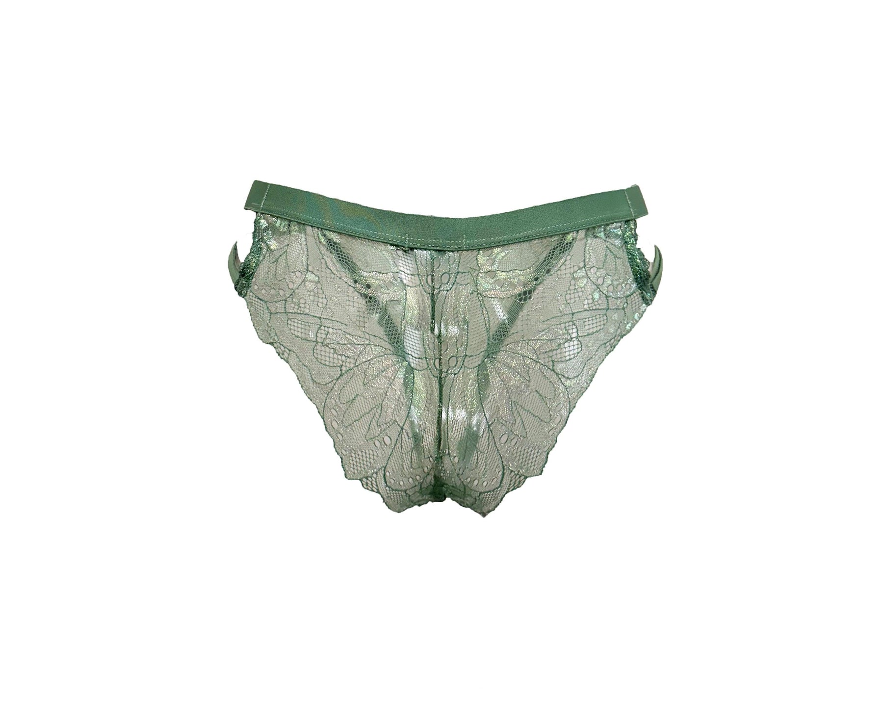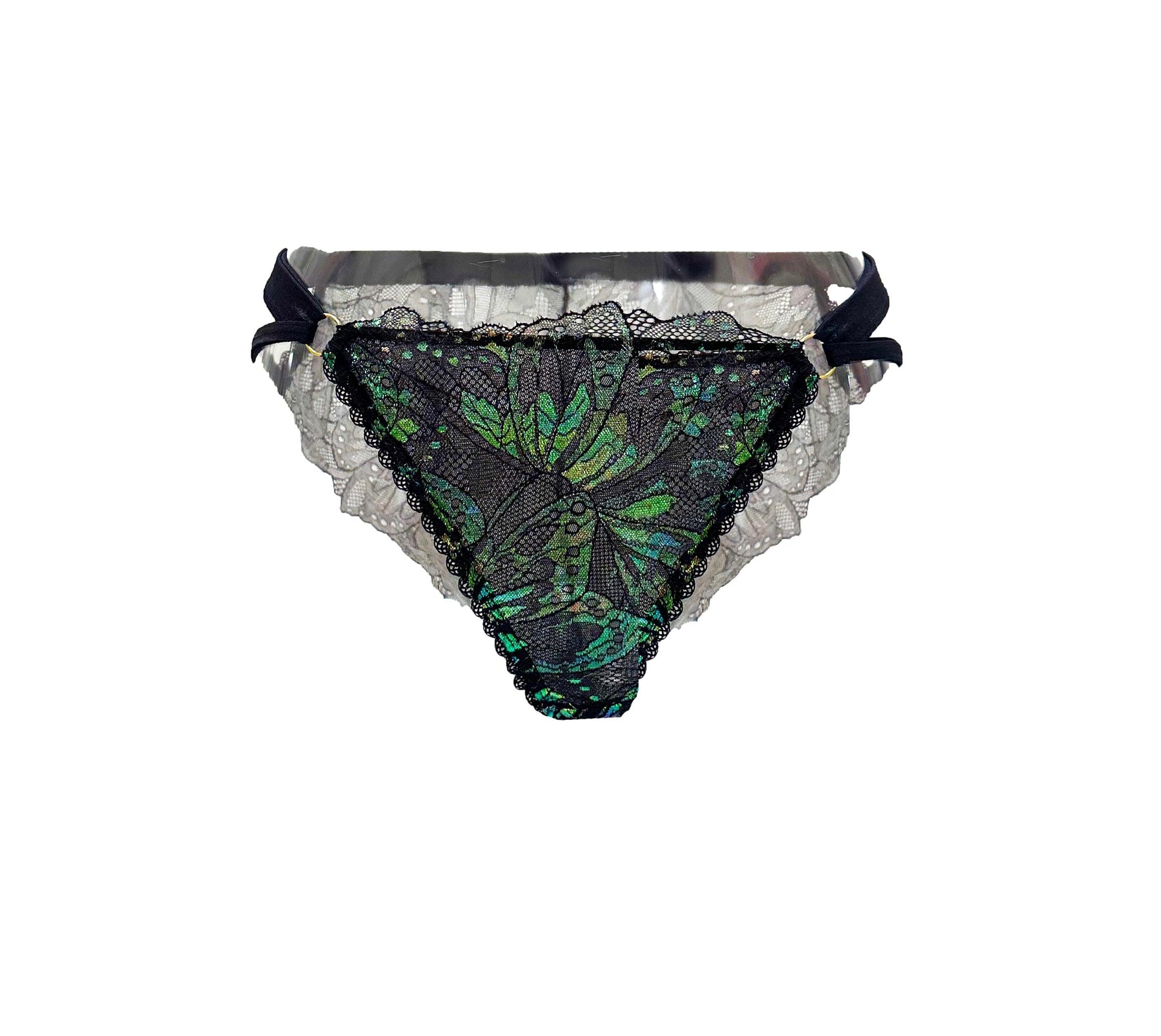 Experience the allure of our Psyche Iridescent Lace Strappy Tanga. Made with iridescent metallic stretch lace, this tanga provides a comfortable and flexible fit. The front is lined with mesh for added coveraget, while the back remains unlined for a provocative touch. Sides feature a soft wide elastic strap and a delicate skinny strap below, finished with rose gold hardware. The crotch is also lined with 100% cotton for ultimate comfort. Available in green and black.