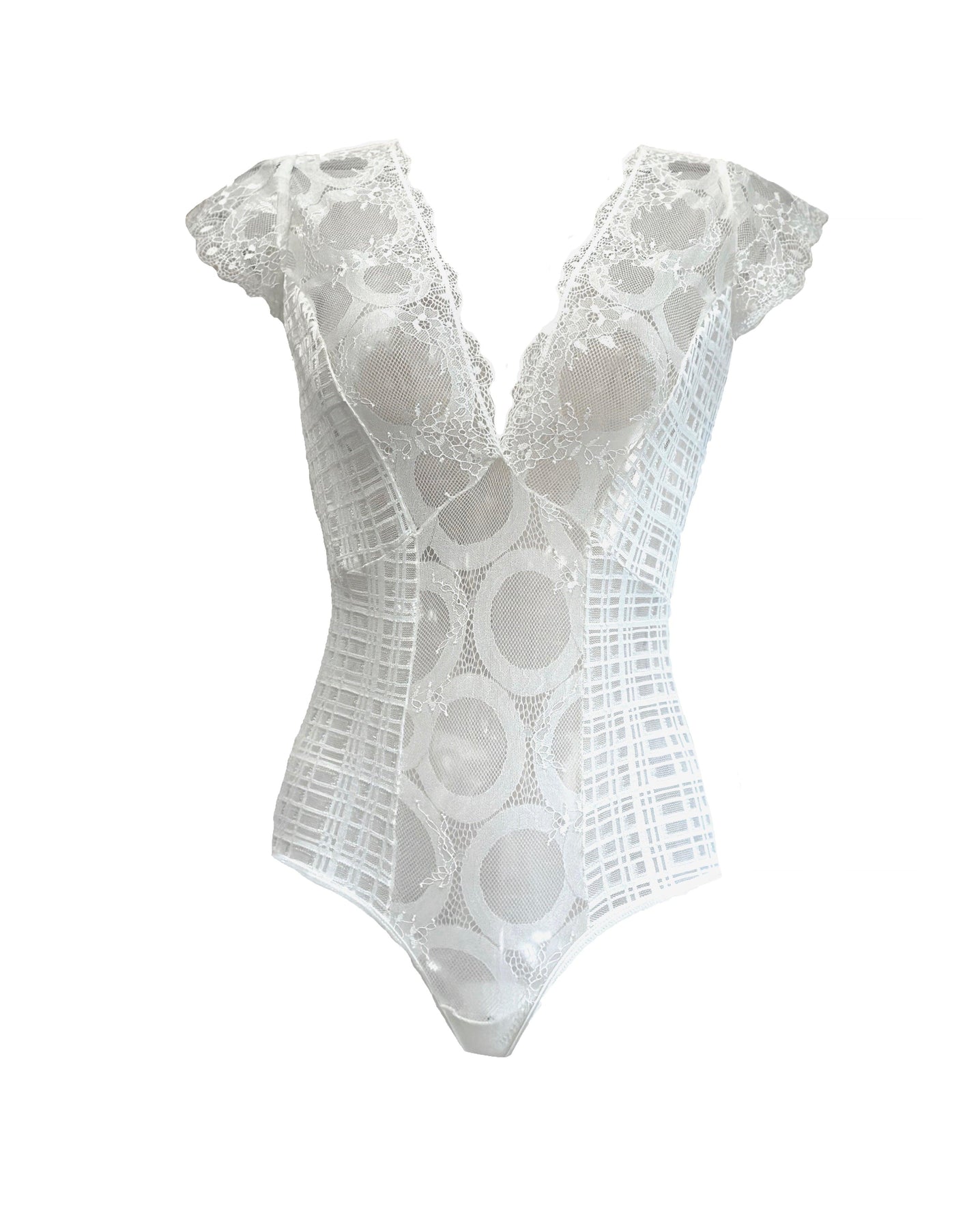Shockingly beautiful for a couple of reasons. Made of sheer circle geometric lace and plaid check tulle, this bodysuit suit has a V-neck, cap sleeves and adjustable inner thighs hook and eye closure for easy undressing. A seduction with a new style "ouvert", which Carol has been calling the "bum cleavage".
