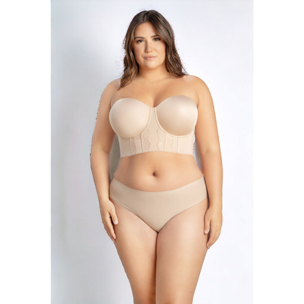 Be fabulous and feel secure with this sophisticated silhouette! Featuring lightly moulded cups with seams that contour your curves and silicone elastic that keeps everything in place, you can focus on enjoying the festivities. Plus, its longline back closure offers extra support for fuller figures and busts, leaving you feeling comfortable and confident!