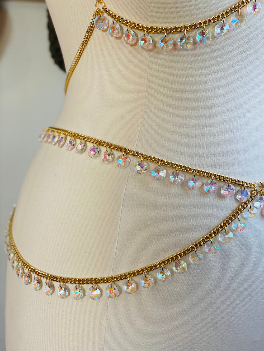 A 2 piece made with vintage inspired chunky gold chain & with crystals as the highlight. Hand placed crystals all over so you can create so many lovely prisms. Created for model Ella Halikas.